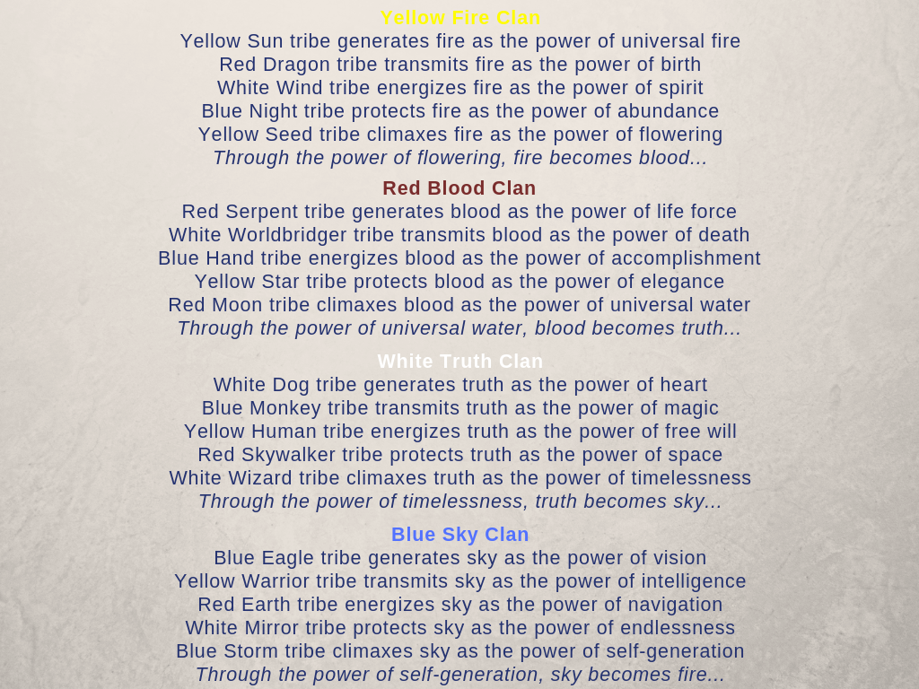 There are four clans. The following slide explains how each archetype transmutes energy and wisdom through the cosmic cycle.