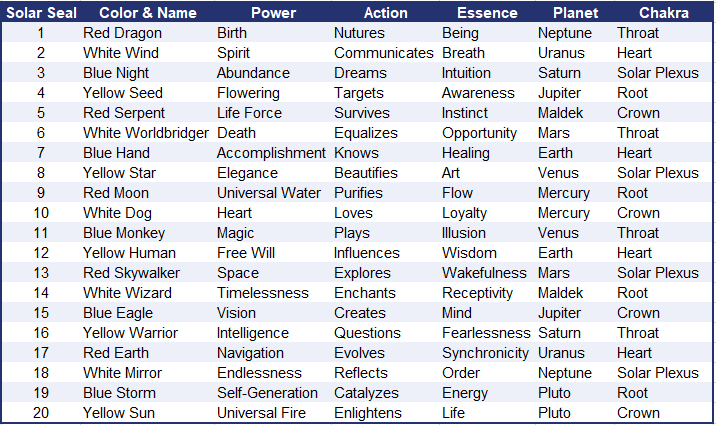 Each galactic signature is a multilayered code. Your signature includes the following elements: a “kin” number, an earth family, a chakra, a planet, and a clan. In total, there are 20 solar seals and each one gets assigned a cosmic tone depending on the moon you were born in (there are 13 tones, i.e. 1 to 13).