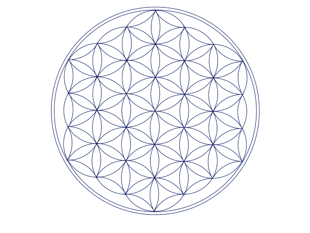 Once the Egg of Life continues to grow, the Flower of Life is created. The Flower of Life is composed of 19 identical circles and 36 partial circular arcs. The whole pattern is enclosed within 2 larger circles.