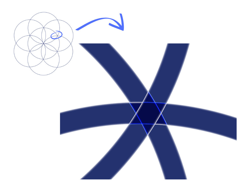 Interestingly, I discovered while playing with special effects in my drawing software that the overlay of 3 circles at the intersection point also creates a tiny Merkaba.