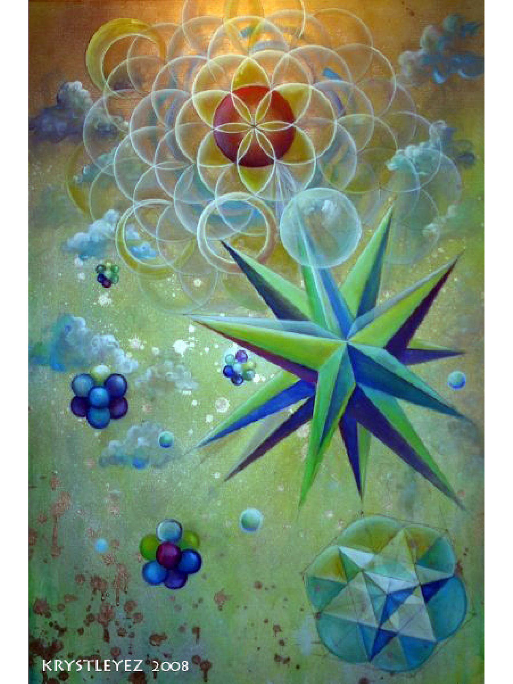 In the following painting by Krystleyez, you can easily spot the small Eggs of Life floating in the air. You can also see a 12-pointed star, called a star dodecahedron. This star can be created by connecting the 12 intersections points of the 12 outer circles necessary to create the Egg of Life. In 2D, this star can be depicted as a star dodecagram. Since the number 12 also symbolizes the illusion of time, you can see that the star dodecagram can be found by connecting the 12 hours on a clock.