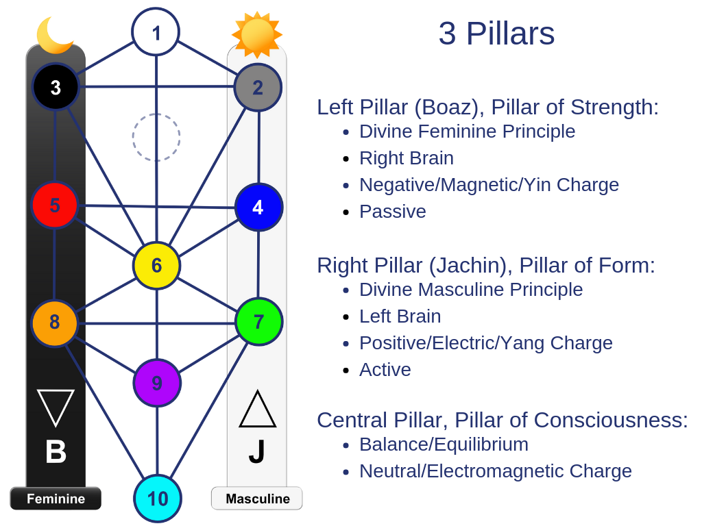 The 10 sephiroth are organized in 3 columns/pillars. The outer pillars are the pillars of Solomon’s Temple (Boaz and Jachin) and symbolize polarity (feminine and masculine principles). The central pillar represents the equilibrium. Note that there is a reversal of polarity that occurs below spheres 2 and 3 (female aspects are transferred to the right pillar vs the male aspects are transferred to the left pillar). Picture this inversion as the reversal effect in the human body, i.e. the right brain (feminine aspect) controls the left side of the body and the left brain (masculine aspect) controls the right side of the body.