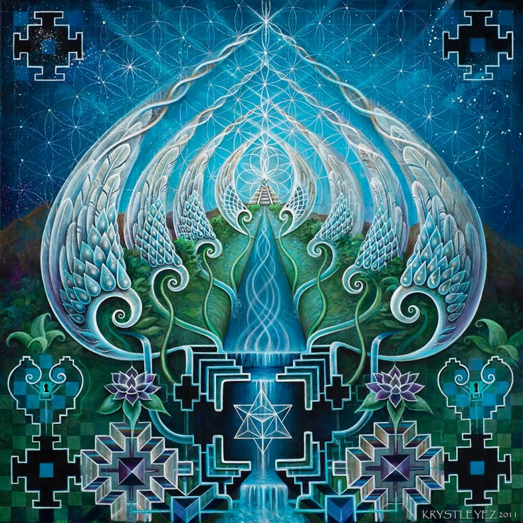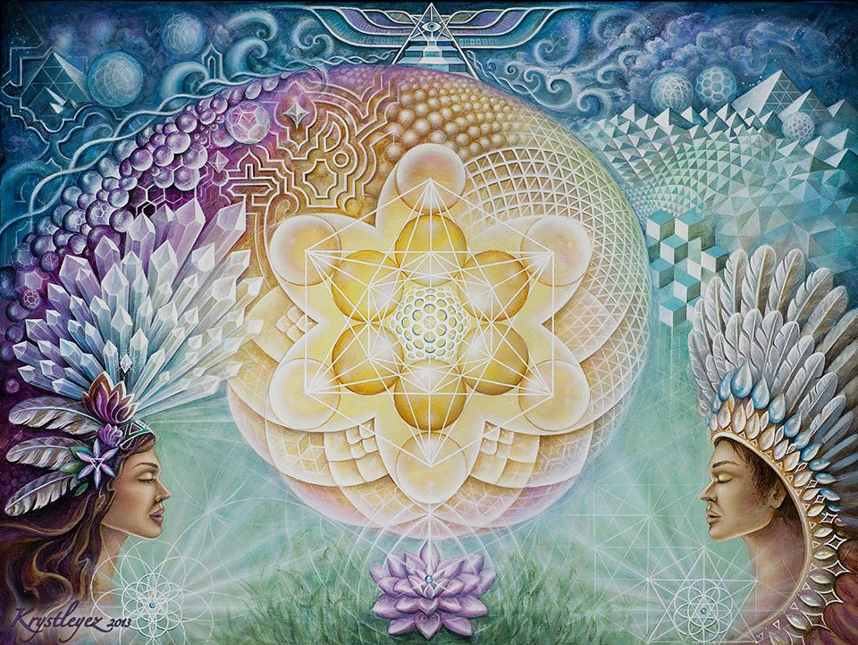 The following painting by Krystleyez beautifully illustrates Metatron’s cube in the center surrounded by the female archetype with spirals and spheres on one side and the male archetype with straight lines and forms on the opposite side.
